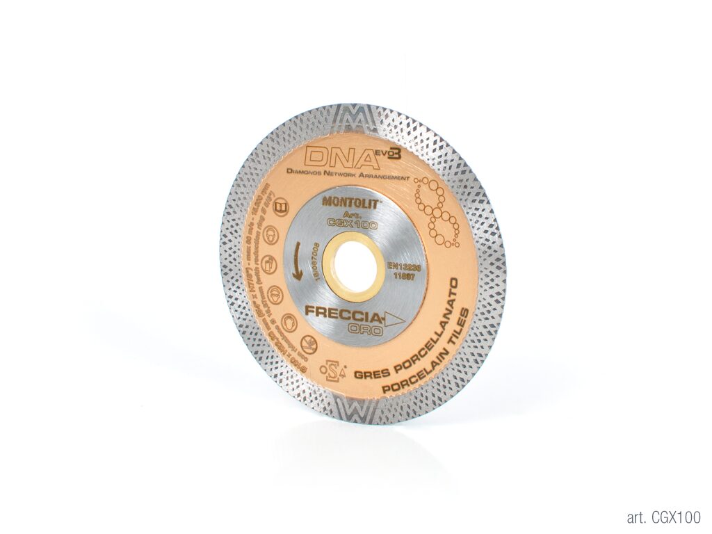 Die Diamanttrennscheibe CGX „Freccia Oro“ ist die ideale professionelle Lösung von Montolit, um exzellente Oberflächen bei Trocken- und Nassschnitten von hartem Keramik und Feinsteinzeug zu erzielen. Mit der DNA-Technologie entwickelt, sorgt sie dafür, dass das Segment der Scheibe die gleiche Menge an Diamantkörnern enthält und somit die gleichen Schneidleistungen bietet.